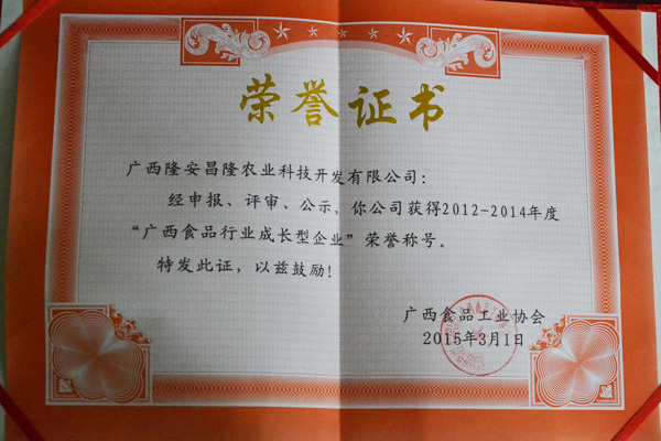 广西食品行业成长型企业荣誉证书